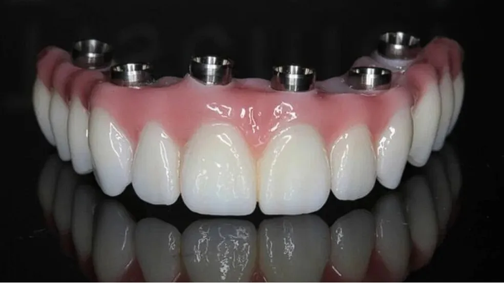Esse pino funciona como a raiz de um dente natural, e sobre ele é fixada uma prótese.